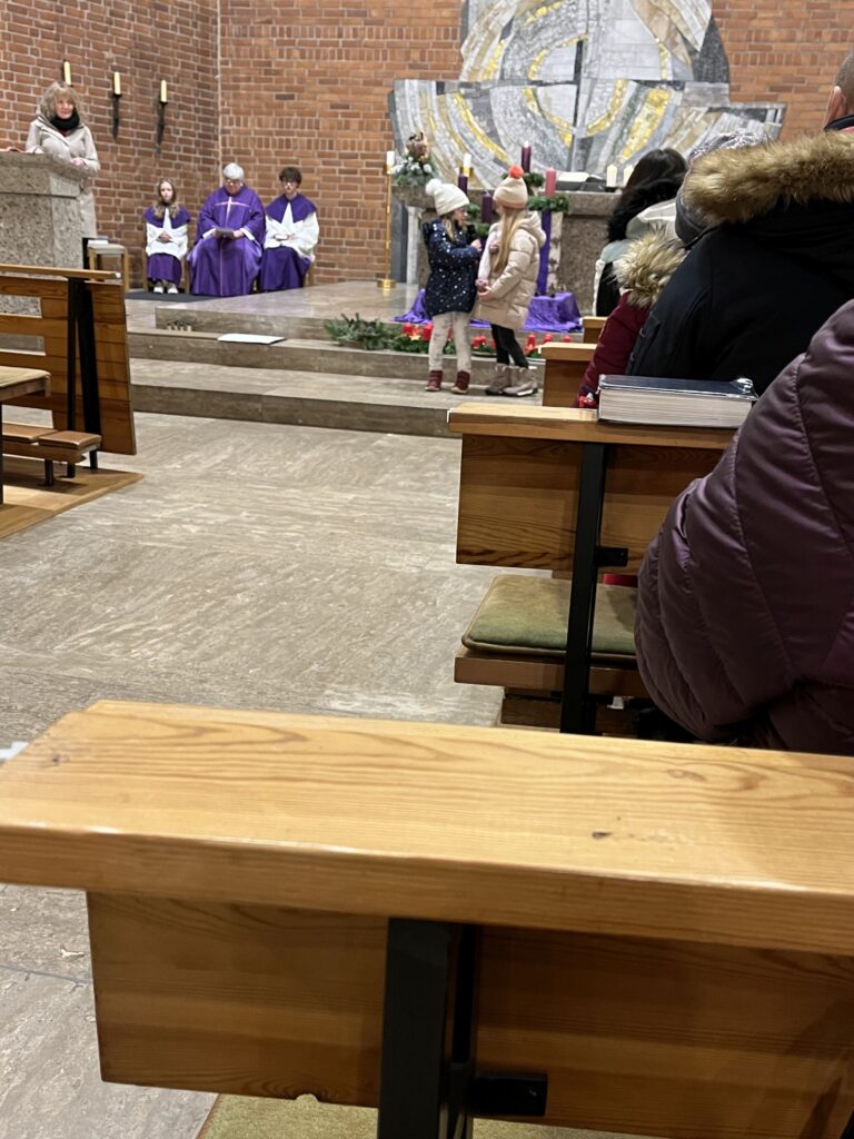 Die Kleinen waren mit voller Aufmerksamkeit, spürbar begeistert dabei. Dass es auch Kinder auf der ganzen Welt gibt, denen es nicht so gut geht, wie uns, brachten die Kindergartenkinder zur Wirkung indem sie die Wünsche dieser Kinder wie: Frieden, Freunde, Brot, Liebe und Gesundheit auf Schilder geschrieben vom Altar aus hochhielten und zeigen durften. Die Fürbitten wurden von den Kindergärtnerinne vorgetragen. Die eifrige Beteiligung der Kinder sorgte für herzerwärmende Stimmung und kam bei allen Besuchern hervorragend an.