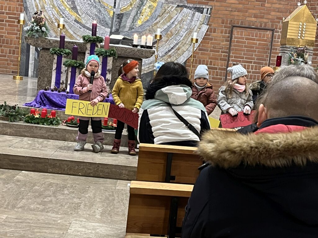 Die Kleinen waren mit voller Aufmerksamkeit, spürbar begeistert dabei. Dass es auch Kinder auf der ganzen Welt gibt, denen es nicht so gut geht, wie uns, brachten die Kindergartenkinder zur Wirkung indem sie die Wünsche dieser Kinder wie: Frieden, Freunde, Brot, Liebe und Gesundheit auf Schilder geschrieben vom Altar aus hochhielten und zeigen durften. Die Fürbitten wurden von den Kindergärtnerinne vorgetragen. Die eifrige Beteiligung der Kinder sorgte für herzerwärmende Stimmung und kam bei allen Besuchern hervorragend an.